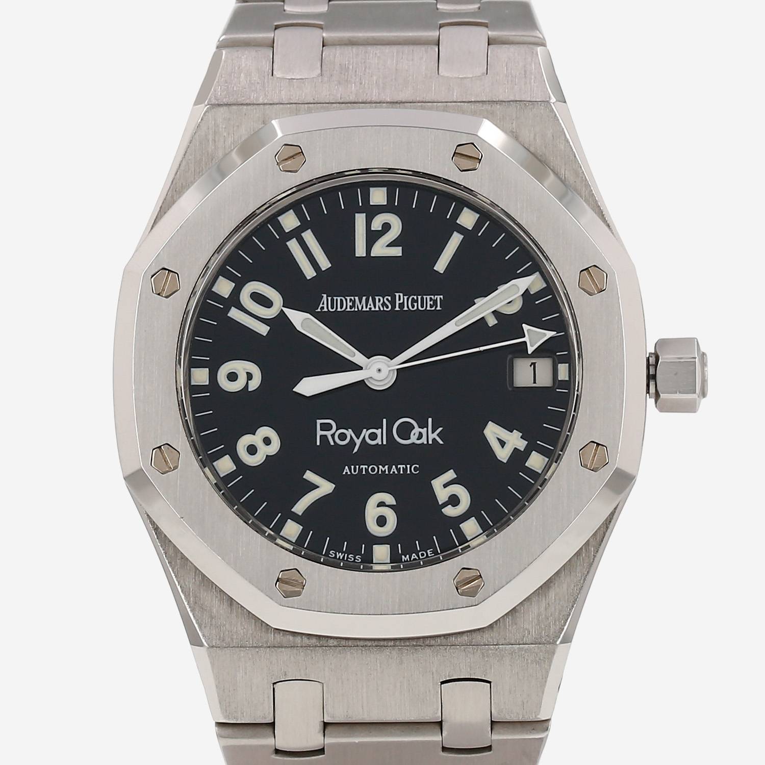 Montre bracelet Audemars Piguet Royal Oak en acier. Boitier octogonal en acier, fond vissé, lunette vissée en acier, couronne cannelée.