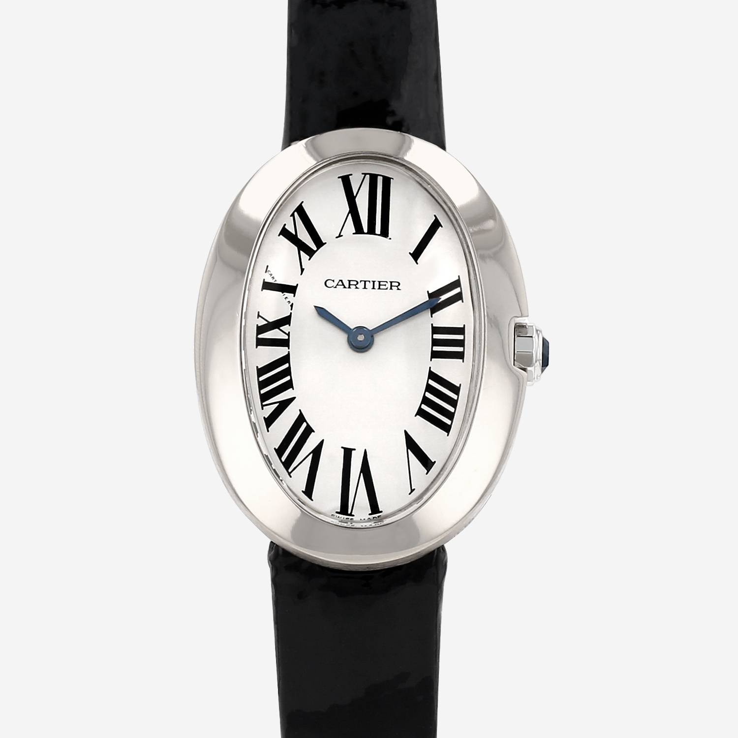 Montre bracelet Cartier Baignoire moyen modèle en or blanc. Boitier ovale en or blanc, fond vissé, couronne sertie d'un cabochon saphir.