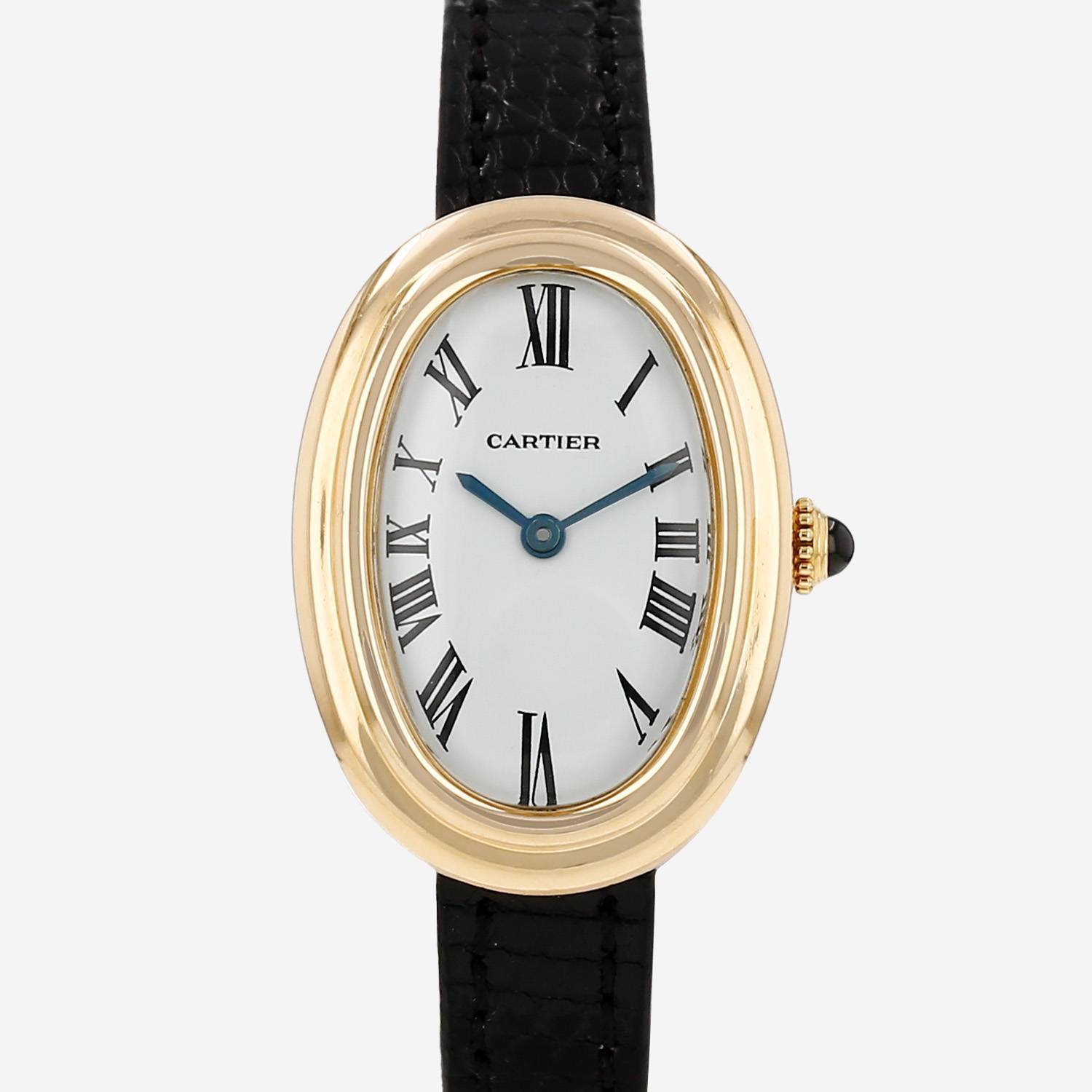 Montre bracelet Cartier Baignoire petit modèle en or jaune. Boitier ovale en or jaune à double godrons, fond vissé, couronne cannelée sertie d'un cabochon saphir.