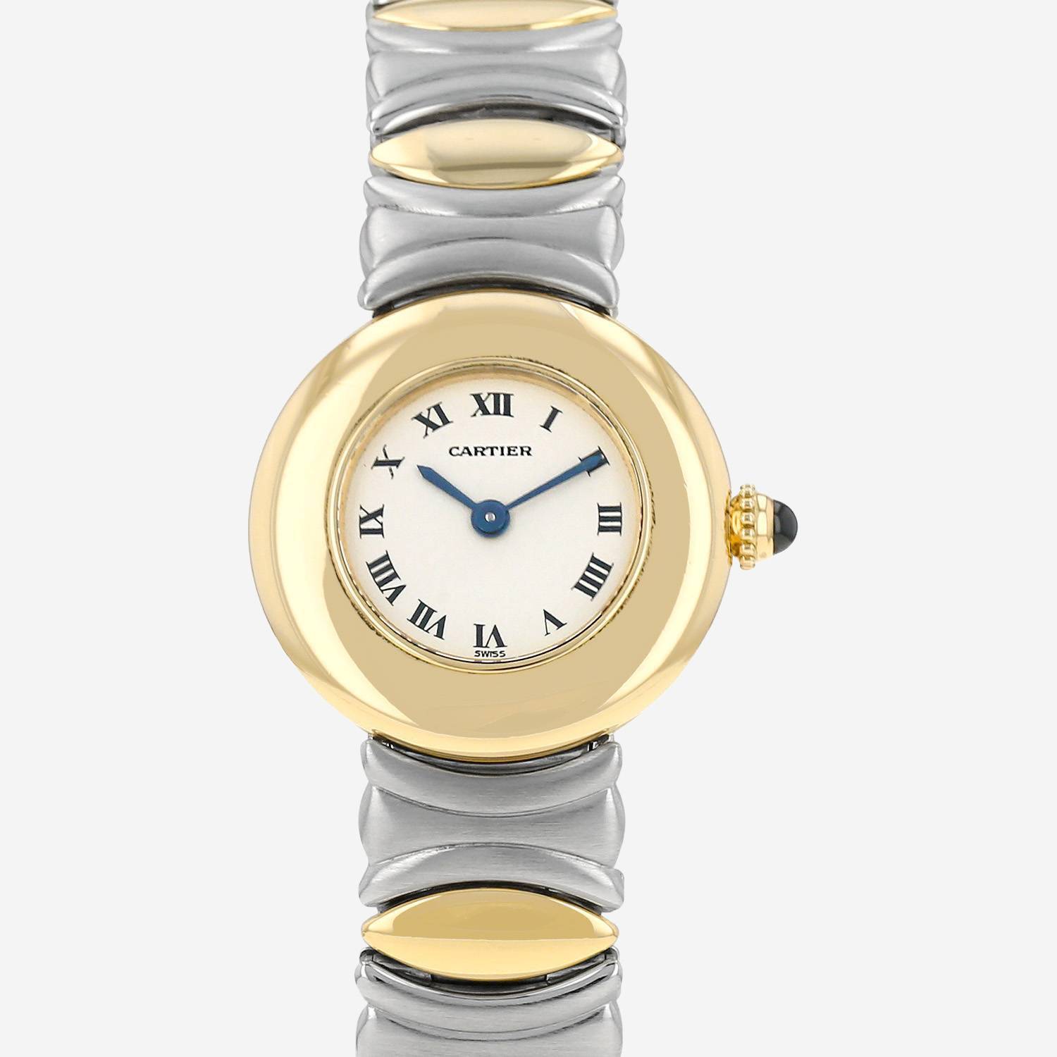 Montre bracelet Cartier Colisee en or et acier. Boitier rond en or jaune, fond vissé, couronne cannelée sertie d'un cabochon de saphir.