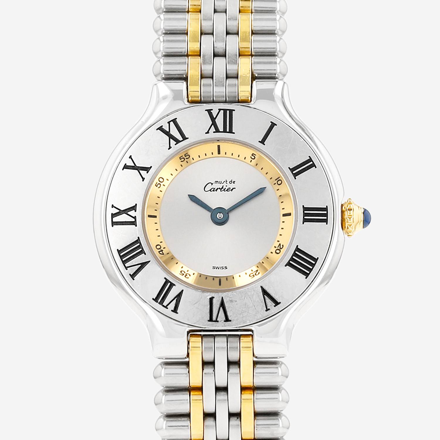 Montre bracelet Cartier Must 21 en acier et plaqué or. Boitier rond en acier, fond vissé, lunette graduée, couronne cannelée sertie d'un cabochon saphir.