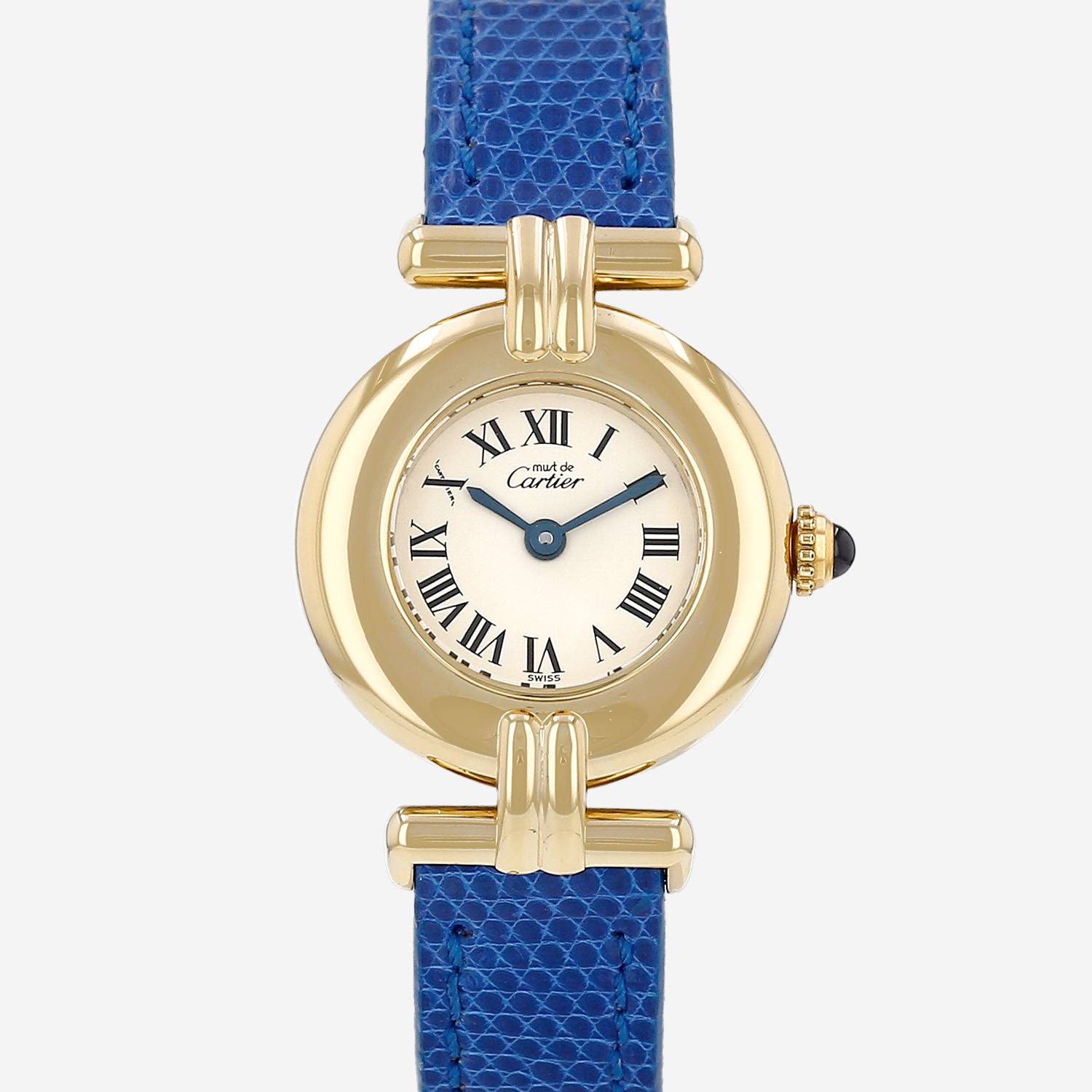 Montre bracelet Cartier Must Colisée en vermeil. Boitier rond en vermeil, fond vissé, couronne cannelée sertie d'un cabochon saphir.