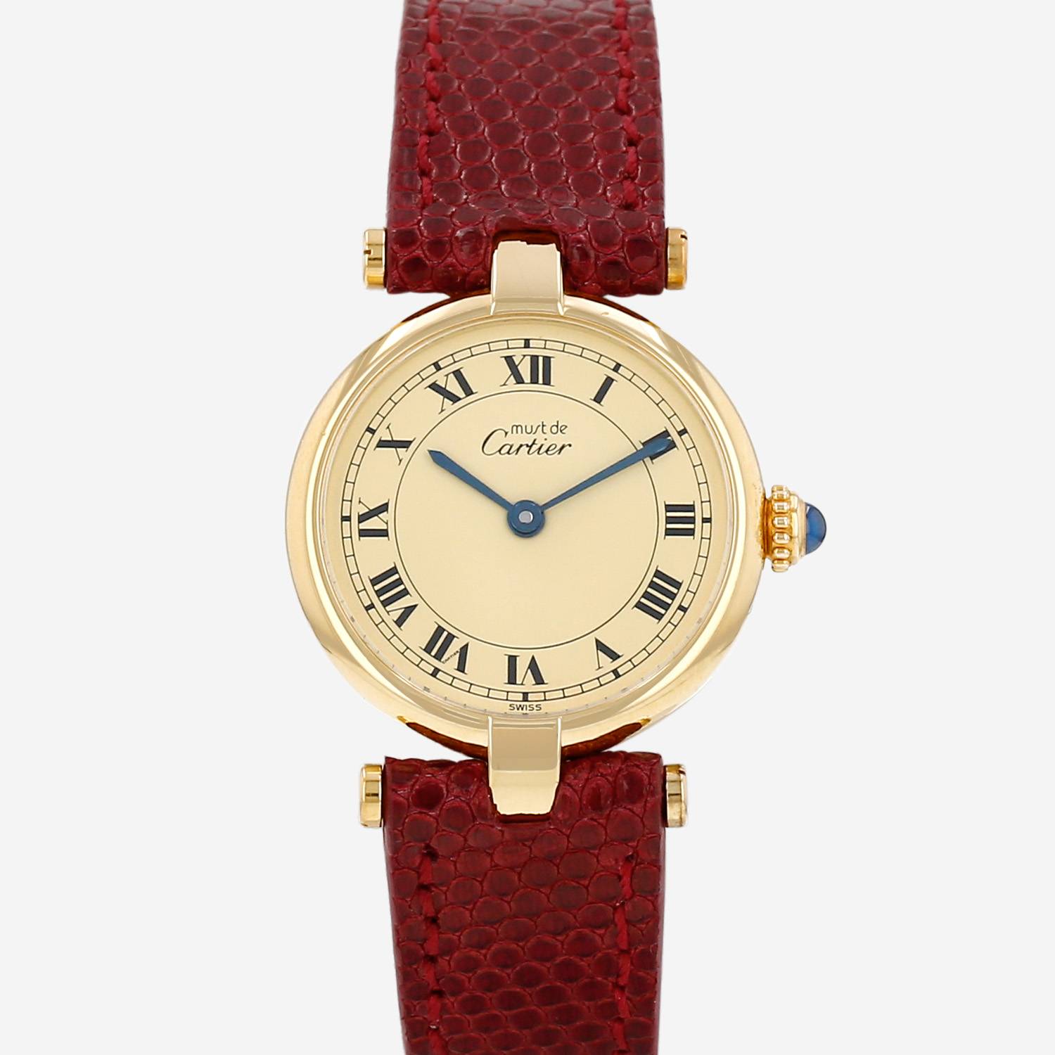 Montre bracelet Cartier Must Vendôme en vermeil. Boitier rond en vermeil, fond clippé, couronne cannelée sertie d'un cabochon saphir.