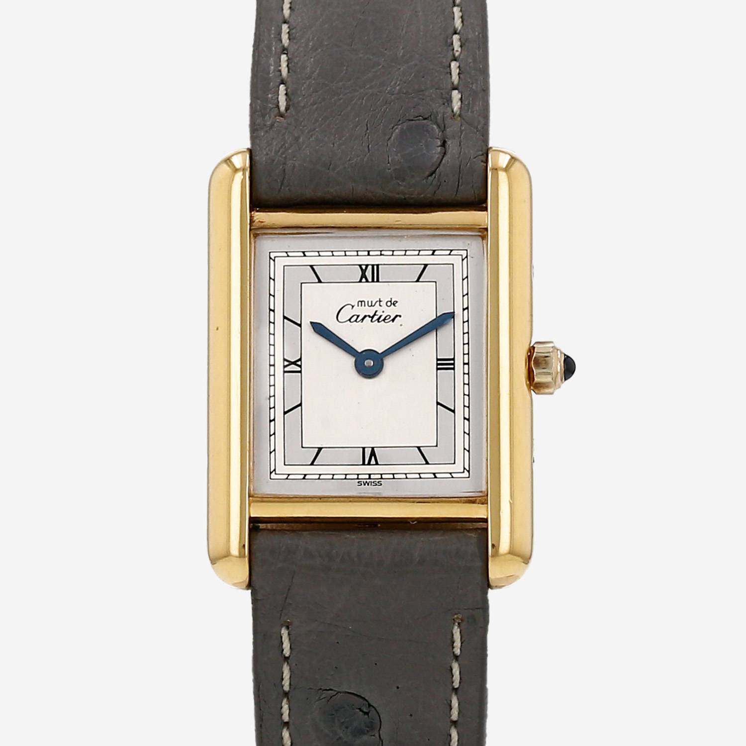 Montre bracelet Cartier Tank Must en vermeil. Boitier rectangulaire en vermeil, fond vissé, couronne sertie d'un cabochon saphir.