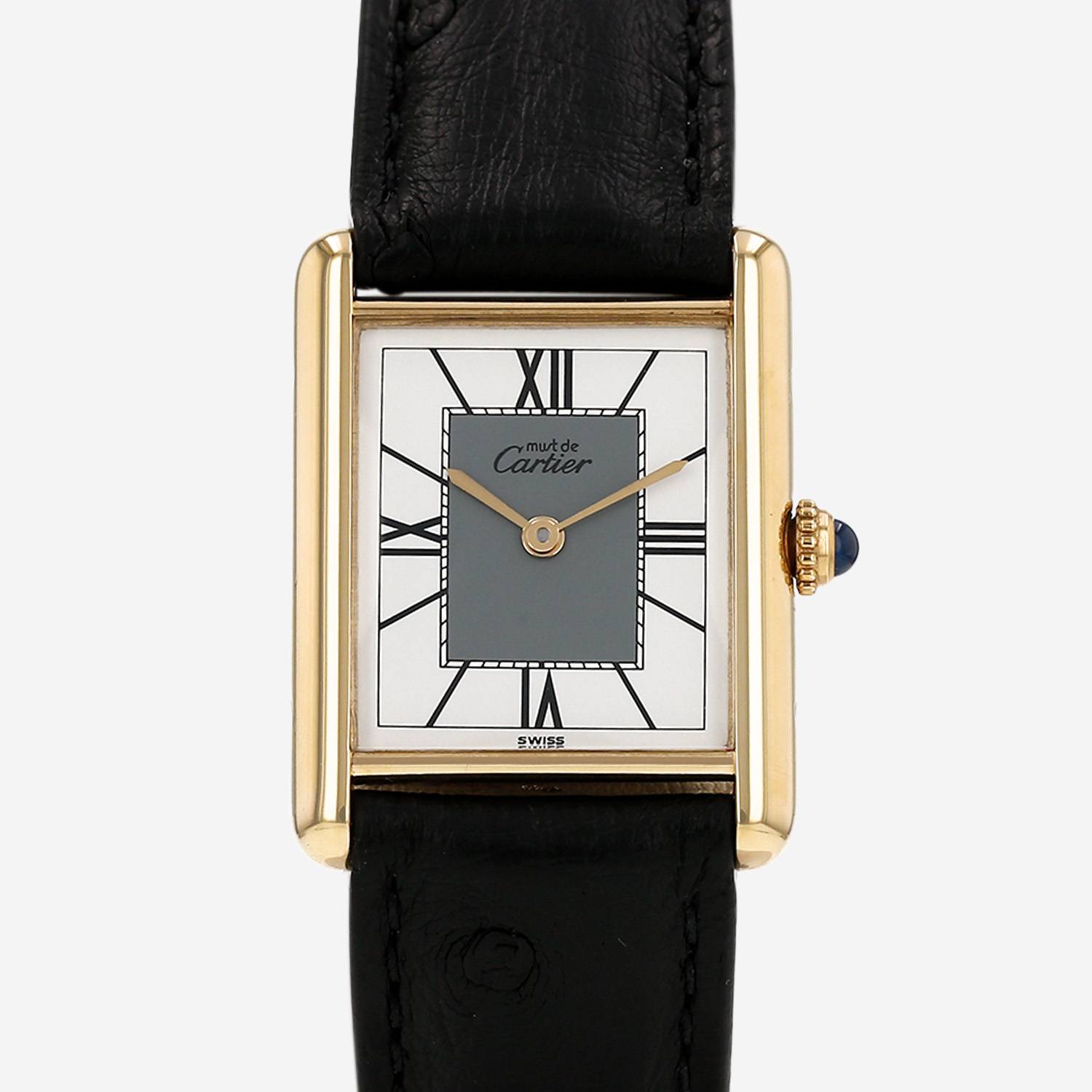 Montre bracelet Cartier Tank Must en vermeil. Boitier rectangulaire en vermeil, fond vissé, couronne cannelée sertie d'un cabochon saphir.