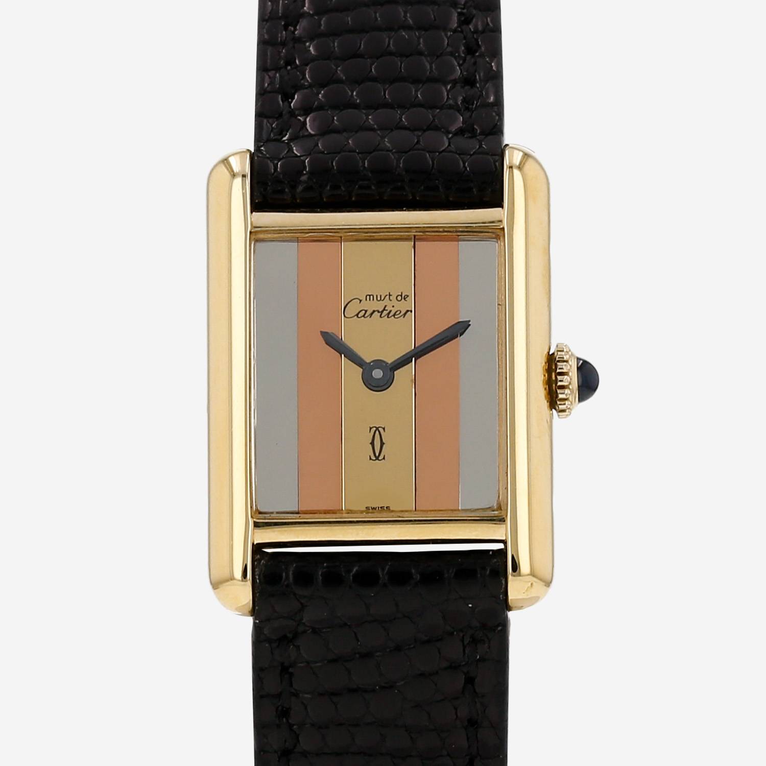 Montre bracelet Cartier Tank Must en vermeil. Boitier rectangulaire en vermeil, fond vissé, couronne sertie d'un cabochon saphir.