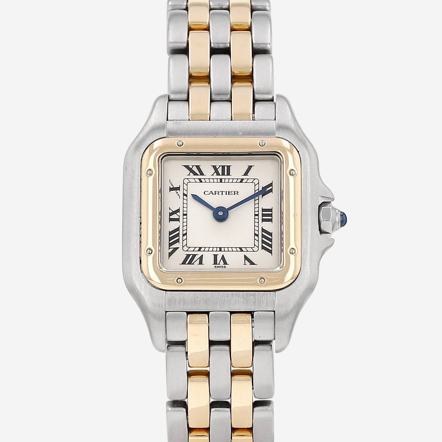 Montre bracelet Cartier Panthère en or et acier. Boitier carré en or et acier, fond vissé, lunette vissée en or jaune, couronne cannelée sertie d'un cabochon saphir.