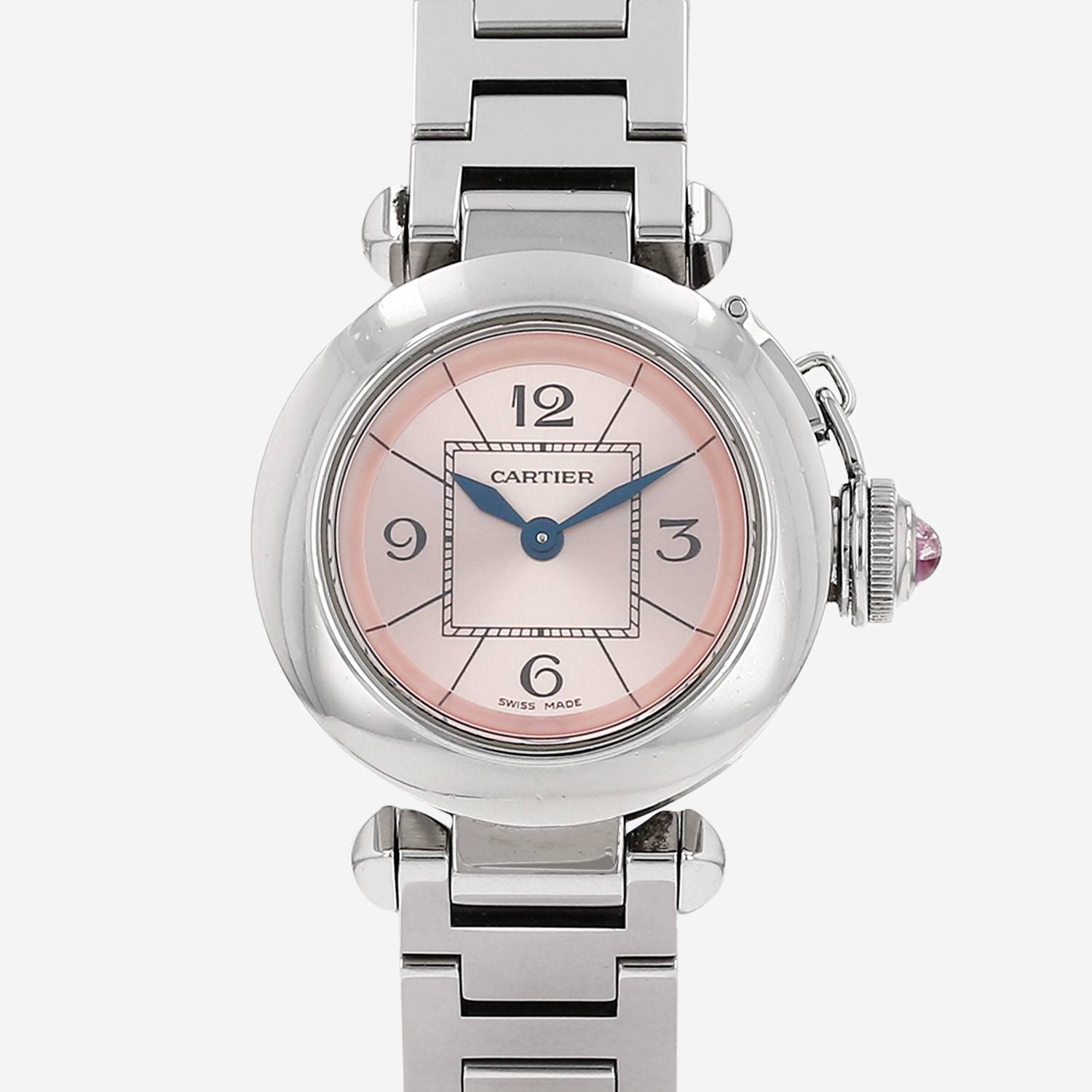 Montre bracelet Cartier Miss Pasha en acier. Boitier rond en acier, fond vissé, protège couronne vissée serti d'un cabochon et rose.