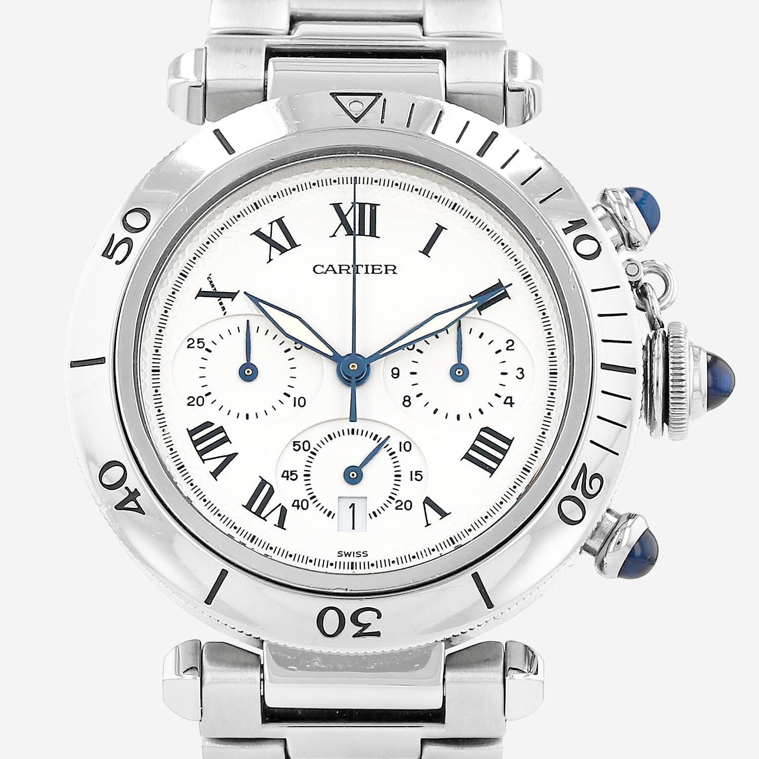 Montre bracelet Cartier Pasha Chrono en acier. Boitier rond en acier, fond vissé, poussoirs pompes, à 2h et 4h, lunette graduée tournante unidirectionnelle, couronne vissée sertie d'un cabochon saphir.
