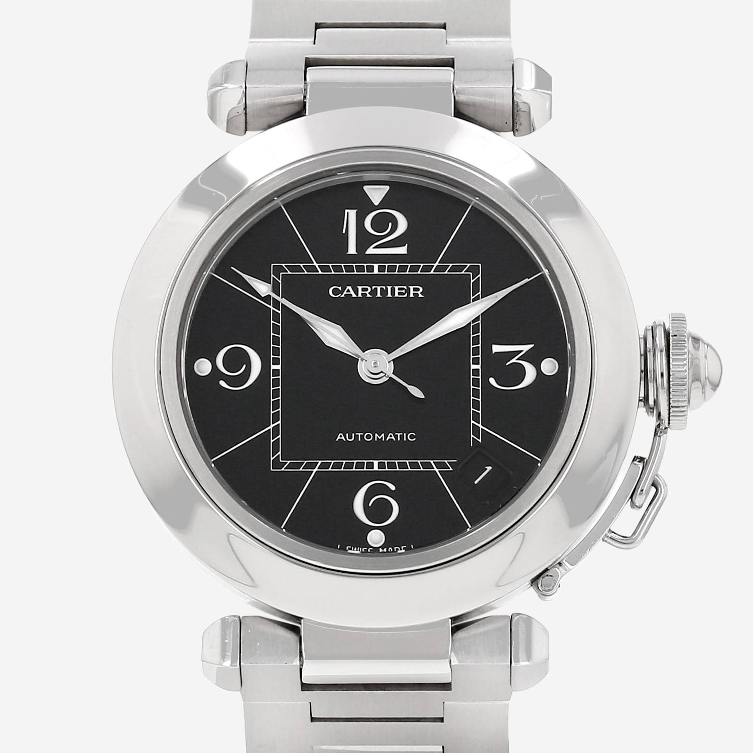 Montre bracelet Cartier Pasha en acier. Boitier rond en acier, fond vissé, protège couronne vissée.