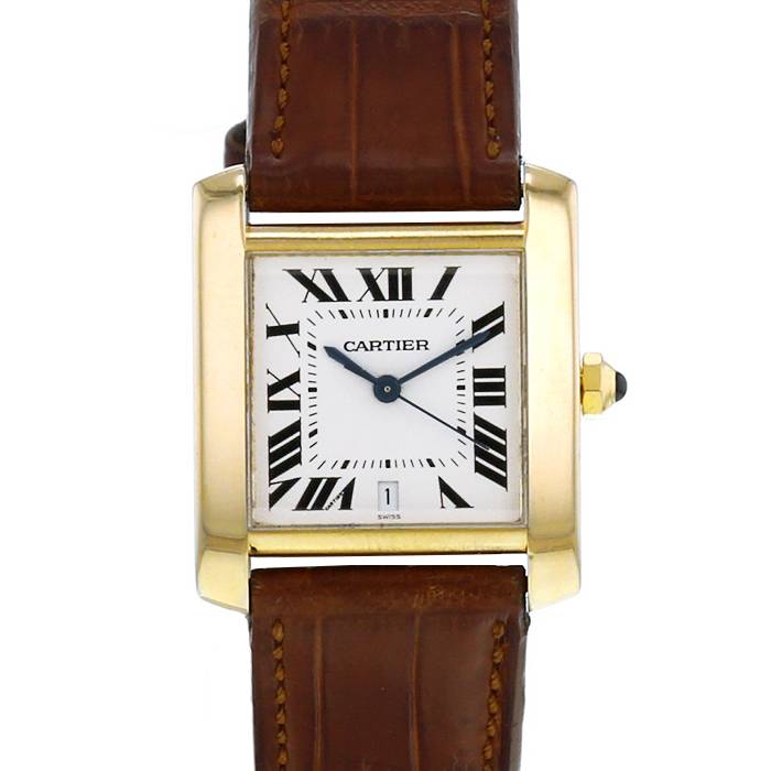 Classique montre bracelet d'homme Cartier Tank Française en or jaune 18k. Boitier carré en or jaune 18k, fond vissé, couronne sertie d'un cabochon de saphir.