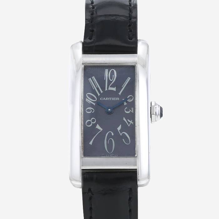 Montre bracelet Cartier Tank Américaine petit modèle en or blanc. Boitier rectangulaire en or blanc, fond vissé, couronne sertie d'un cabochon de saphir et bleu.