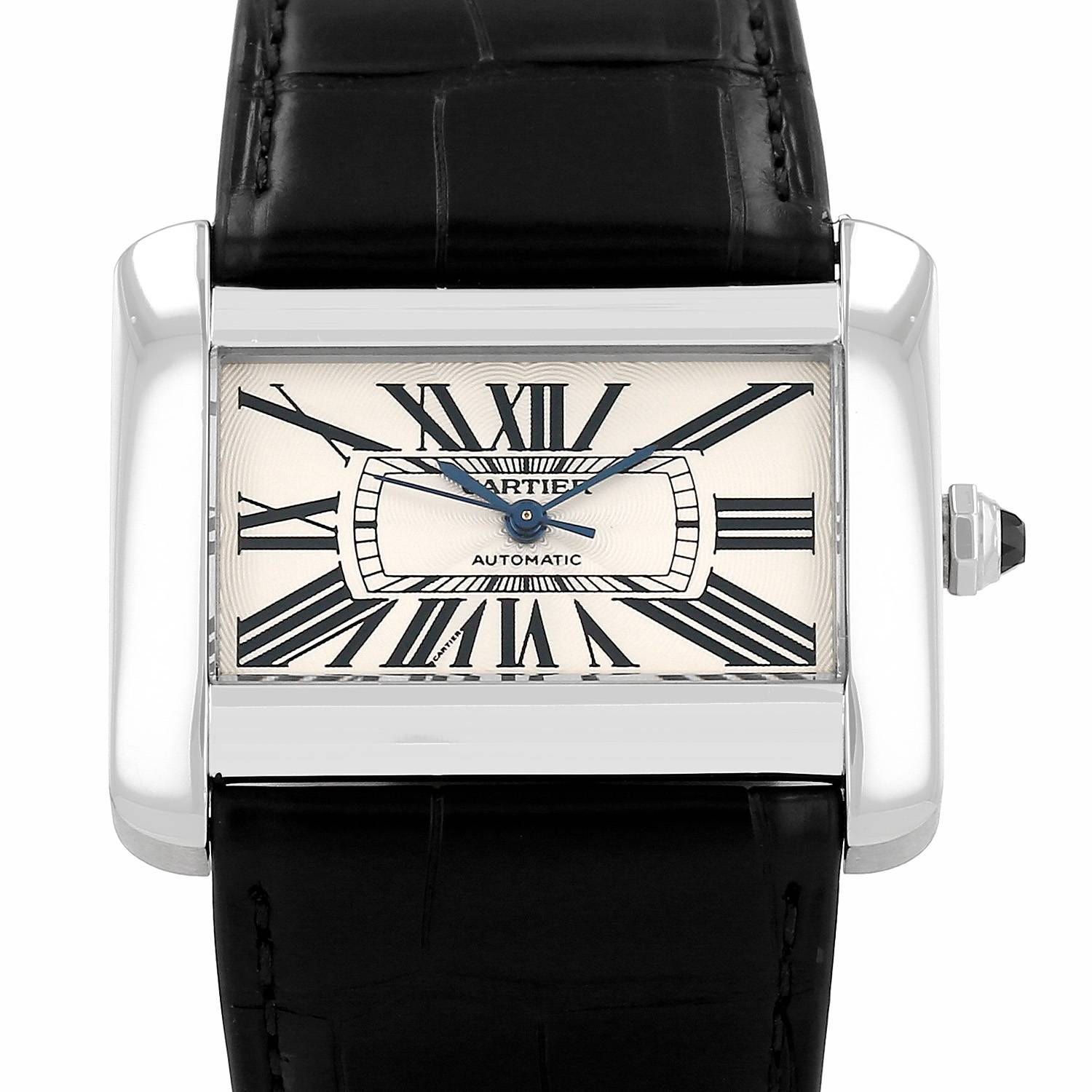 Montre bracelet Cartier Tank Divan en acier. Grand boitier rectangulaire en acier, fond vissé, couronne sertie d'un cabochon saphir.