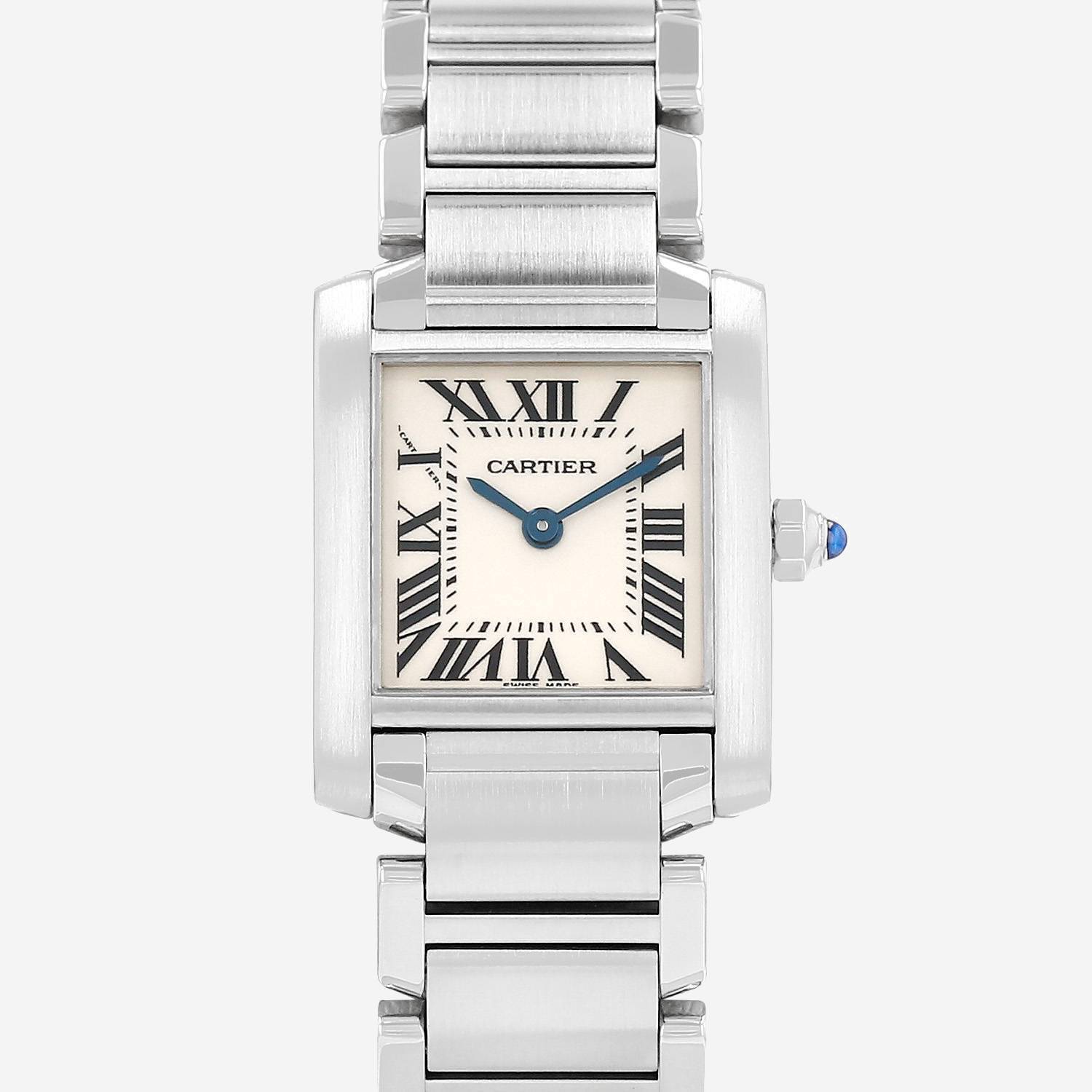 Montre bracelet Cartier Tank Française en acier. Boitier rectangulaire en acier, fond vissé, couronne sertie d'un cabochon saphir.