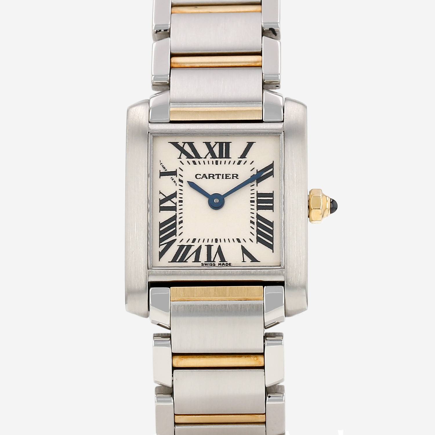 Montre bracelet Cartier Tank Française petit modèle en or et acier. Boitier rectangulaire en or et acier, fond vissé, couronne cannelée sertie d'un cabochon saphir.
