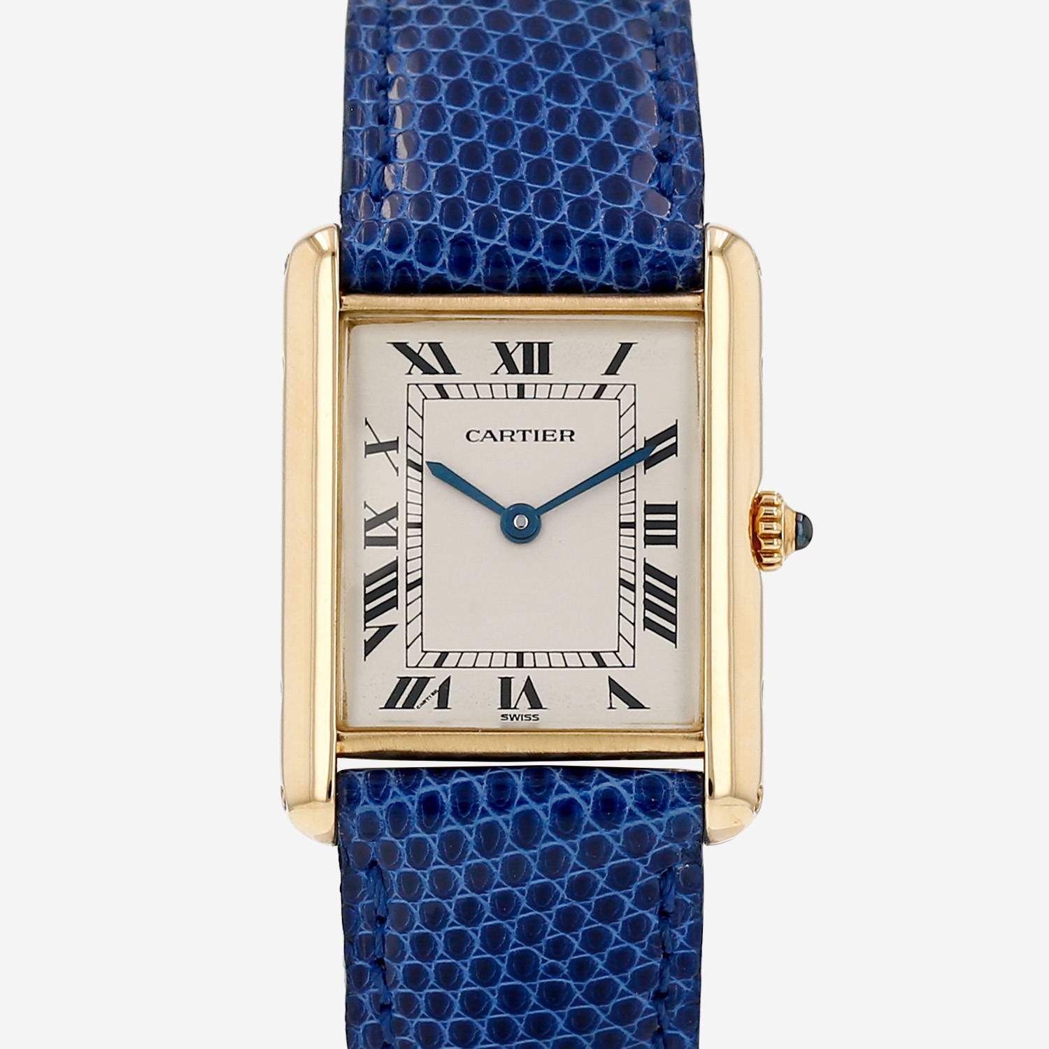 Montre bracelet Cartier Tank Louis Cartier en or jaune. Boitier rectangulaire en or jaune, fond vissé, couronne cannelée sertie d'un cabochon saphir.