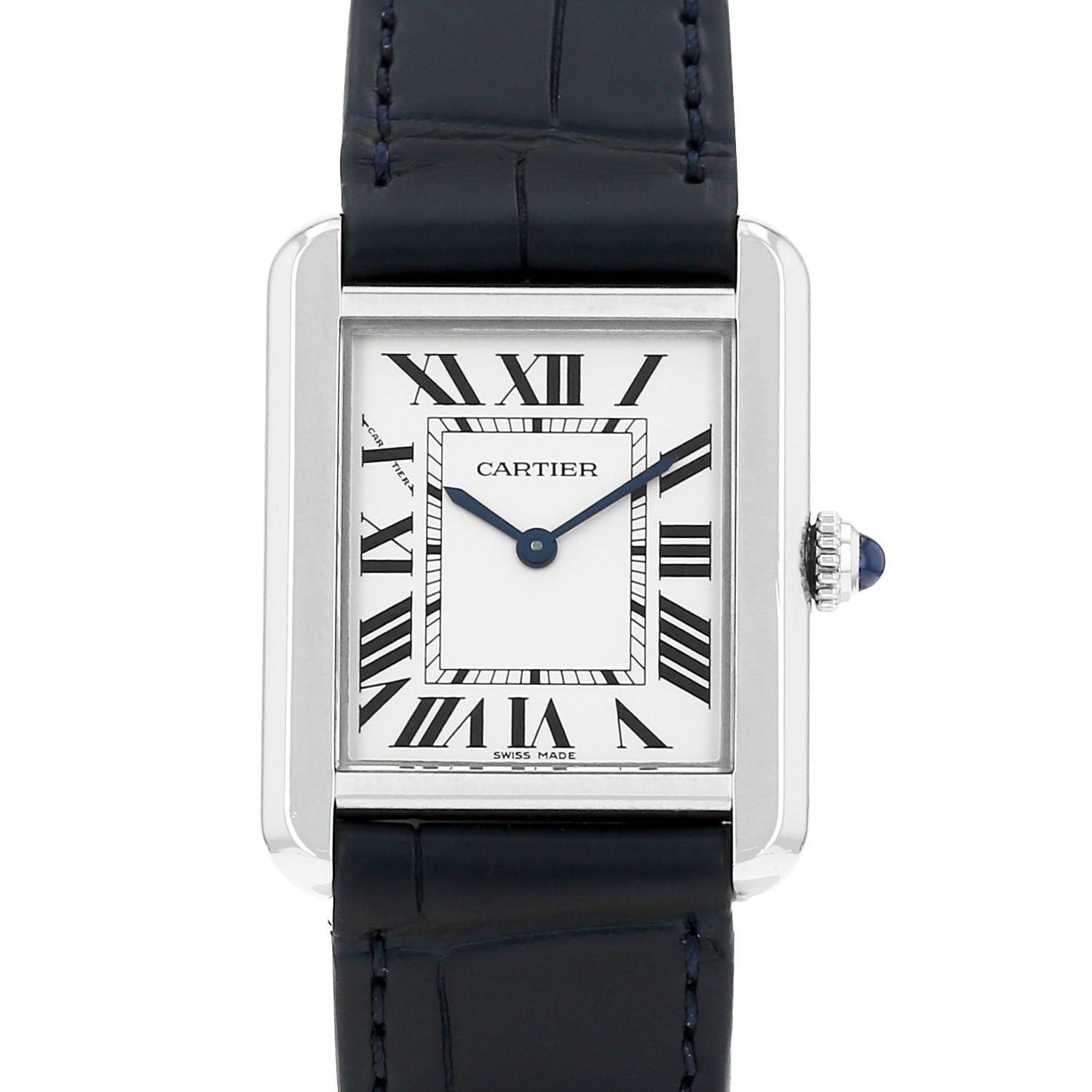 Montre bracelet Cartier Tank Solo en acier. Boitier rectangulaire en acier, fond vissé, couronne cannelée sertie d'un cabochon saphir.