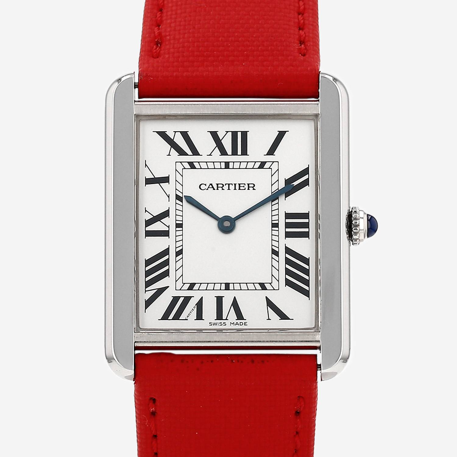 Montre bracelet Cartier Tank Solo grand modèle en acier. Boitier rectangulaire en acier, fond vissé, couronne cannelée sertie d'un cabochon saphir.