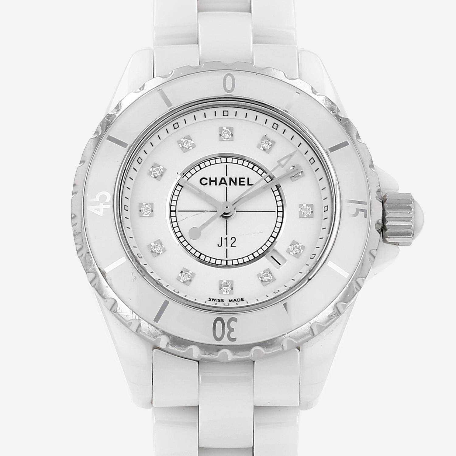 Montre bracelet Chanel J12 en céramique blanche et acier. Boitier rond en céramique, fond vissé, lunette graduée tournante unidirectionnelle, couronne vissée sertie d'un cabochon.