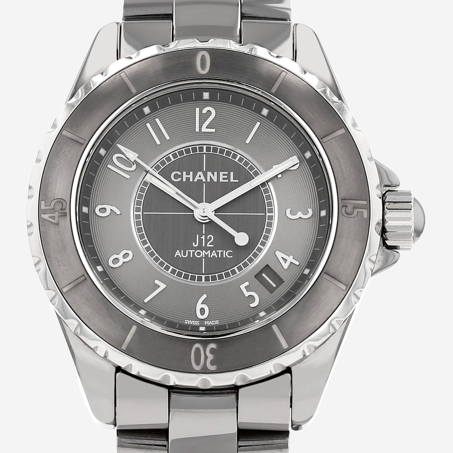 Montre bracelet Chanel J12 en céramique de titane gris anthracite. Boitier rond en céramique de titane, lunette graduée tournante unidirectionnelle, couronne vissée.