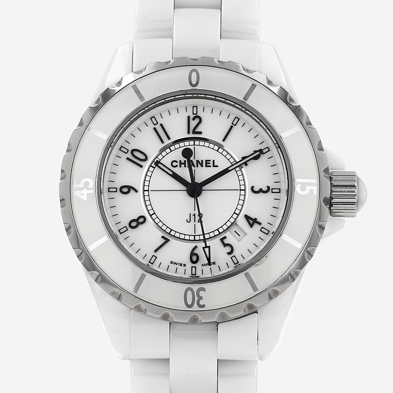 Montre bracelet Chanel J12 en céramique et acier. Boitier rond en céramique, fond vissé, lunette graduée tournante unidirectionnelle, couronne vissée sertie d'un cabochon.