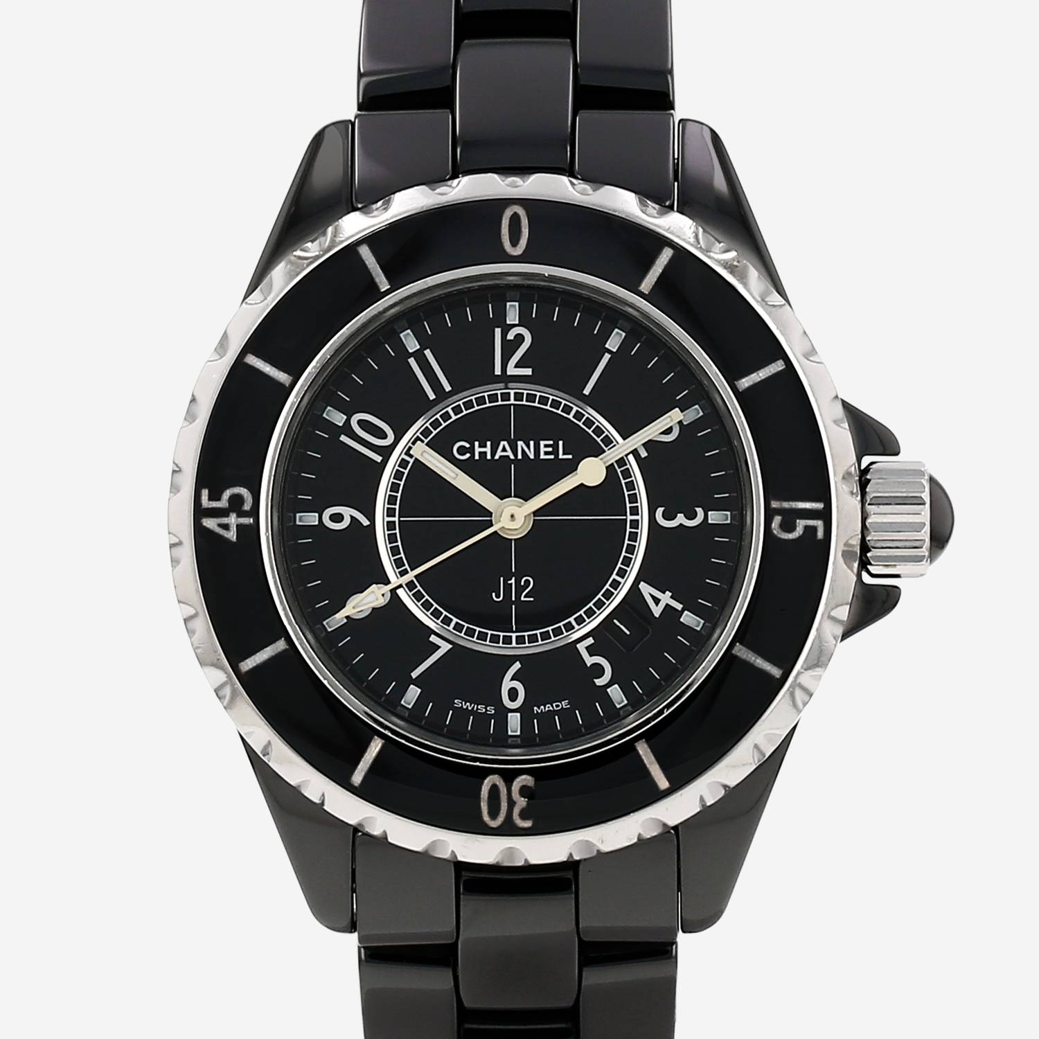 Montre bracelet Chanel J12 en céramique. Boitier rond en céramique, fond vissé, lunette graduée tournante en acier, couronne vissée sertie d'un cabochon noir.