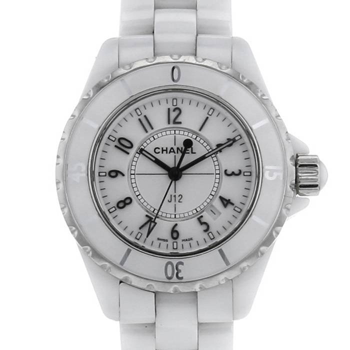 Montre bracelet de dame Chanel J12 en céramique blanche. Boitier rond en céramique, fond vissé, lunette graduée tournante unidirectionnelle.