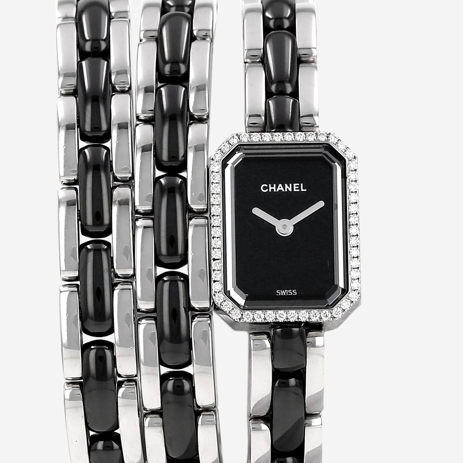 Montre bracelet Chanel Première Rock en acier. Boitier octogonal en acier diamanté, fond vissé, couronne de mise à l'heure intégré au boîtier.