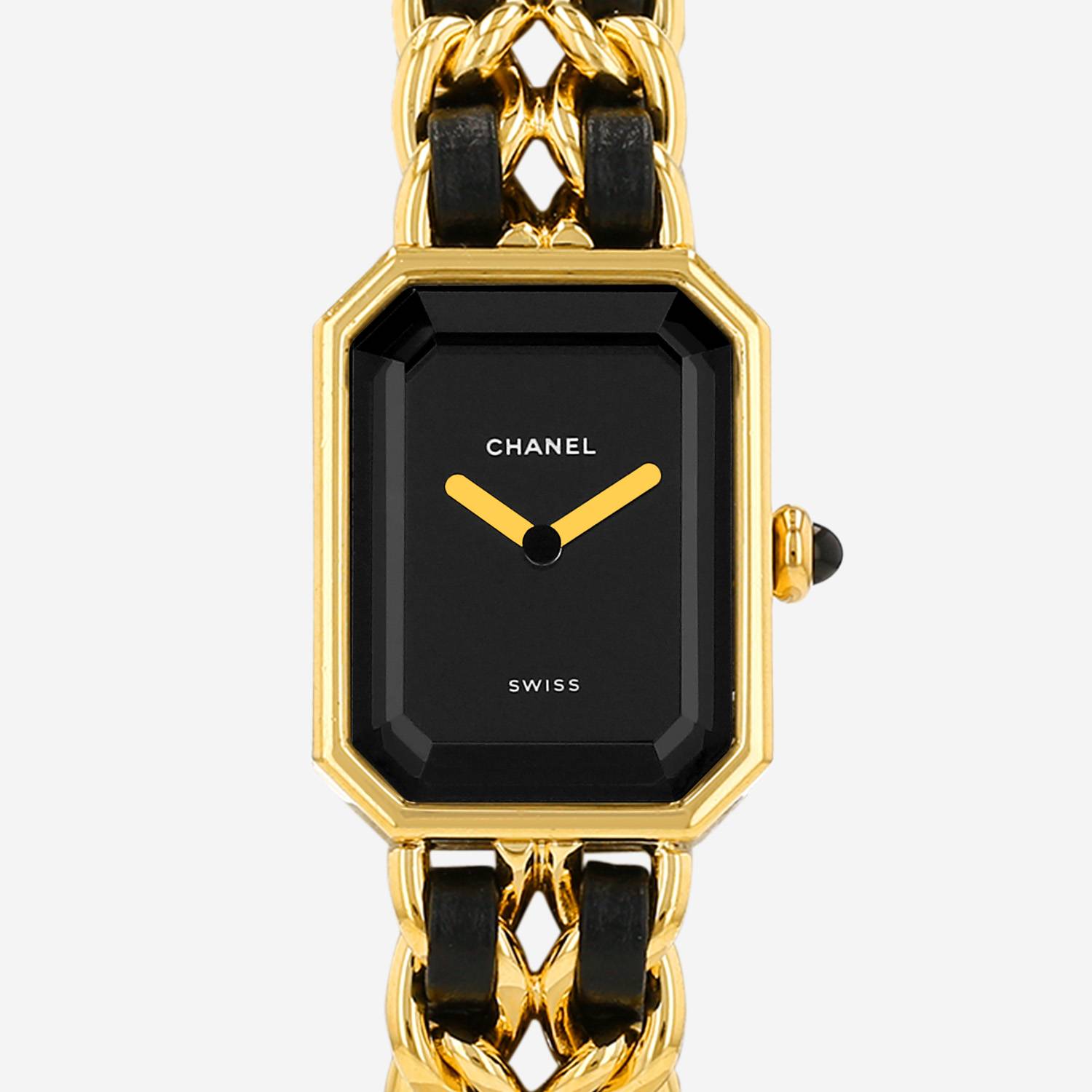 Montre bracelet Chanel Première taille L en plaqué or. Boitier octogonal en plaqué or avec verre facetté, fond clippé, couronne sertie d'un cabochon noir.