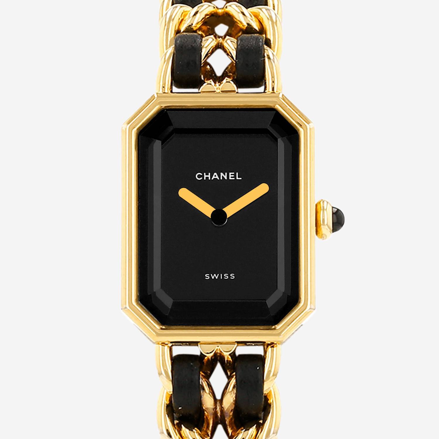 Montre bracelet Chanel Première taille L en plaqué or. Boitier octogonal en plaqué or avec verre facetté, fond clippé, couronne sertie d'un cabochon noir.