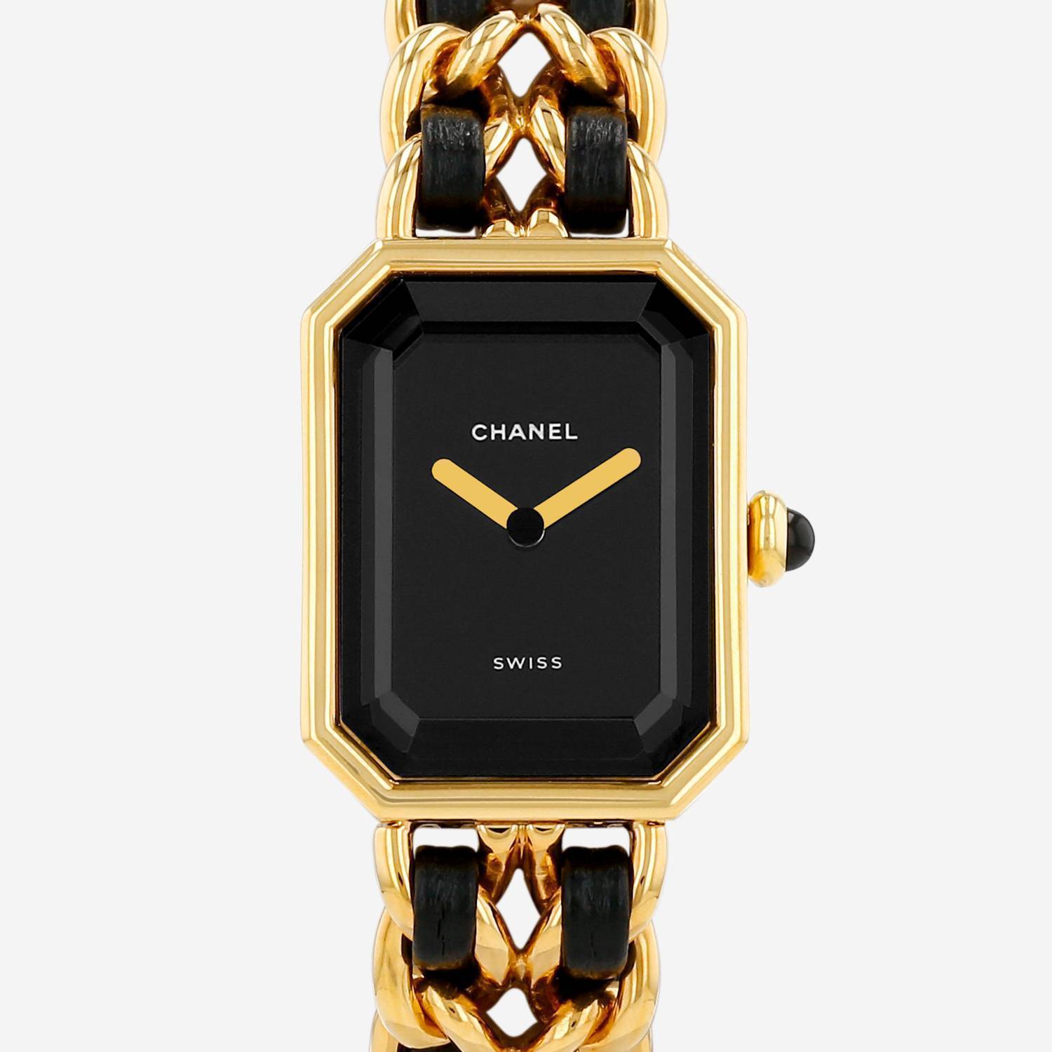 Montre bracelet Chanel Première taille S en plaqué or. Boitier octogonal en plaqué or avec verre facetté, fond clippé, couronne sertie d'un cabochon noir.