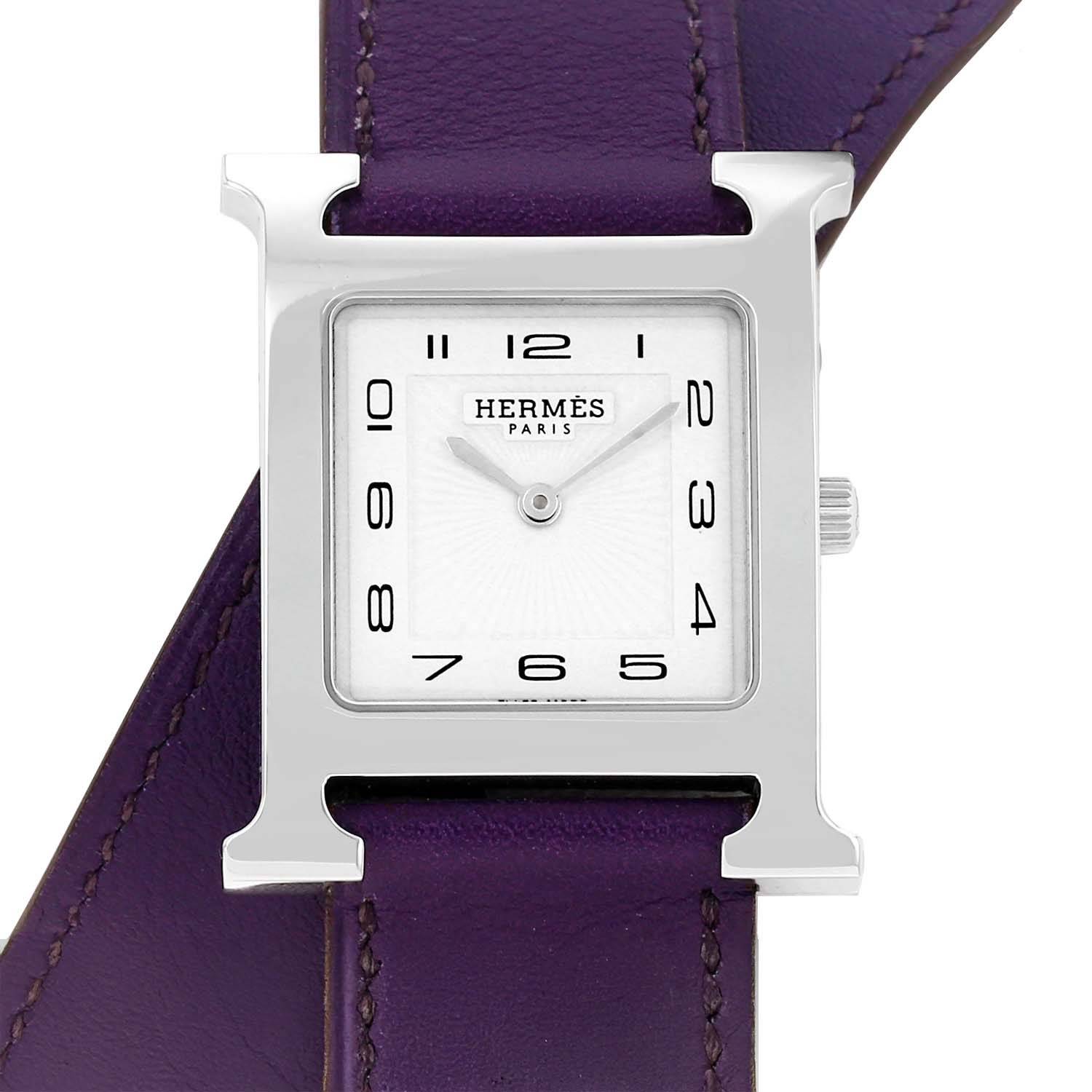 - Bracelet en cuir violet signé Hermès, boucle ardillon en acier signée Hermès.