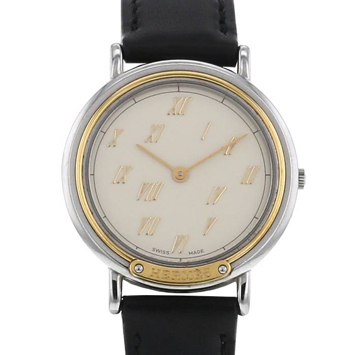 Élégante montre bracelet Hermès Météore en plaqué or et acier. Boitier rond en acier, lunette en plaqué or, couronne cannelée.