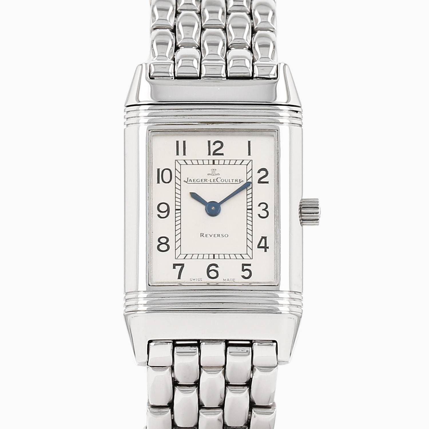 Montre bracelet Jaeger-LeCoultre Reverso Lady en acier. Boitier rectangulaire en acier reversible à triple godrons, fond vissé, couronne cannelée.