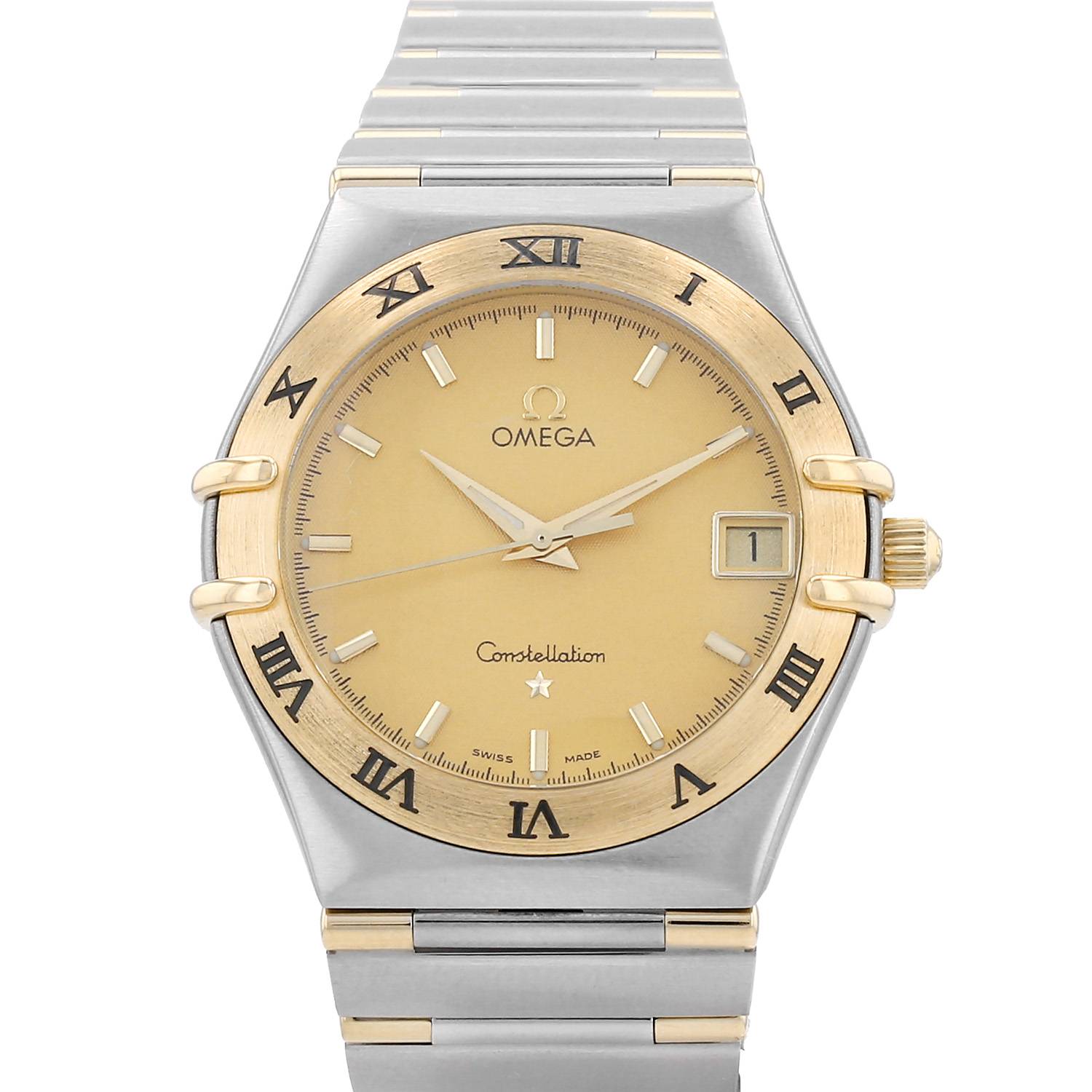 Montre bracelet Omega Constellation en or et acier. Boitier rond en or et acier, fond clippé, lunette graduée, couronne cannelée.
