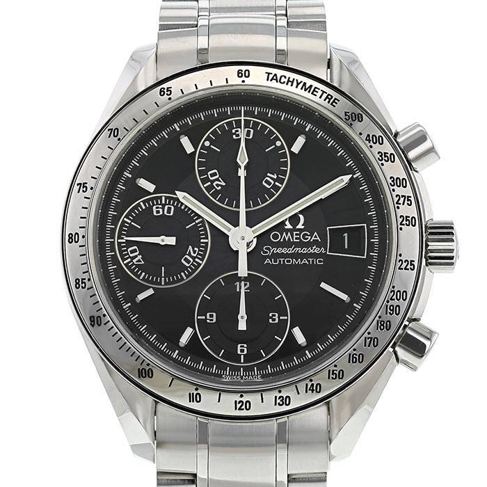 Montre bracelet Omega Speedmaster Automatic en acier. Boitier rond en acier, fond clippé, poussoirs lisses, lunette tachymètre en acier, couronne cannelée.