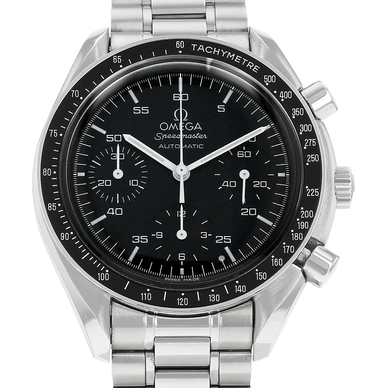 Montre bracelet Omega Speedmaster Automatic en acier. Boitier rond en acier, fond clippé, poussoirs ronds à pompe, à 2h et 4h, lunette tachymètre, couronne cannelée.
