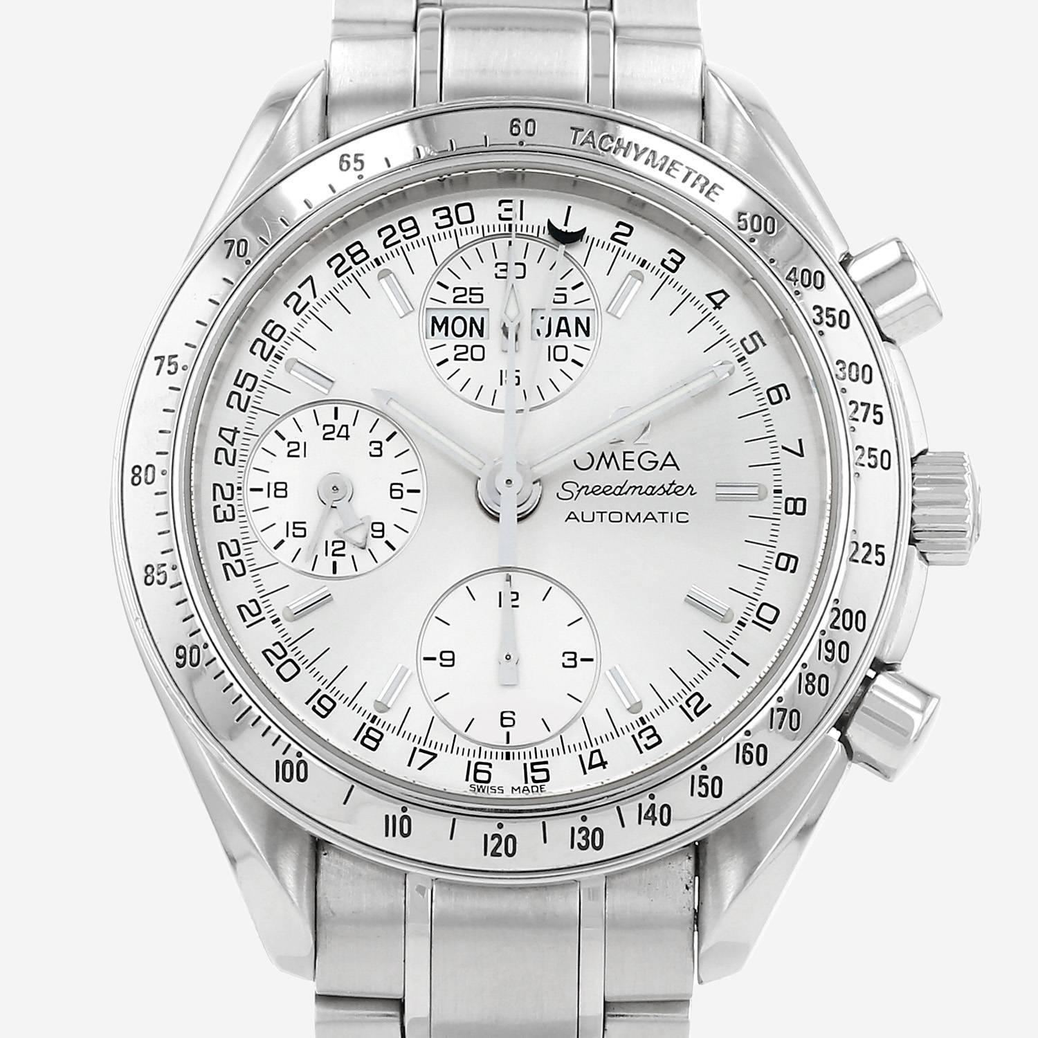 Montre bracelet Omega Speedmaster Automatic en acier. Boitier rond en acier, fond clippé, poussoirs ronds , à 2h et 4h, lunette tachymètre en acier, couronne cannelée.