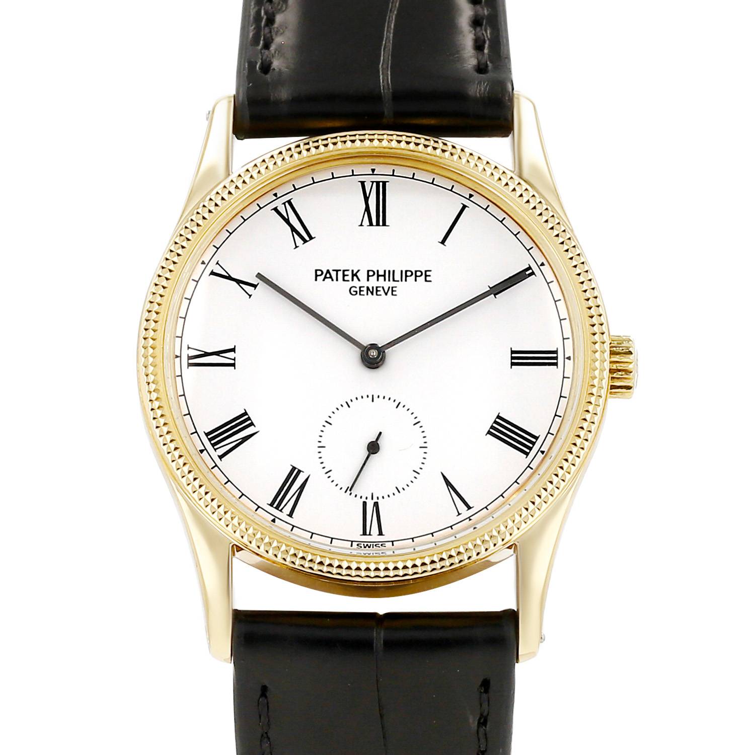 Montre bracelet Patek Philippe Calatrava en or jaune. Boitier rond en or jaune décor clous de Paris, fond clippé, lunette à décor de "clous de Paris" en or jaune, couronne cannelée.