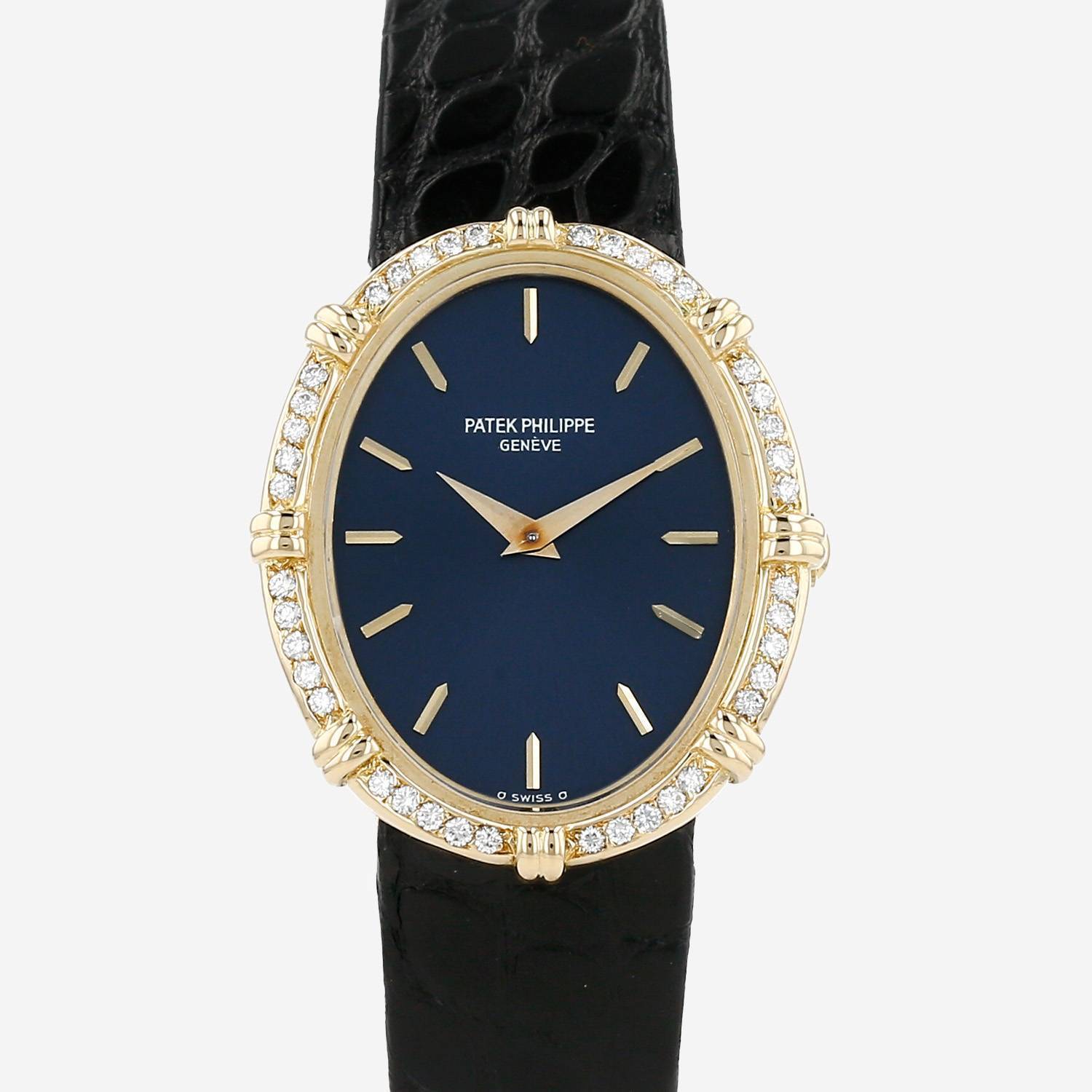 Montre bracelet Patek Philippe Ellipse Lady en or jaune. Boitier ovale en or jaune, fond clippé, lunette diamantée, couronne cannelée.