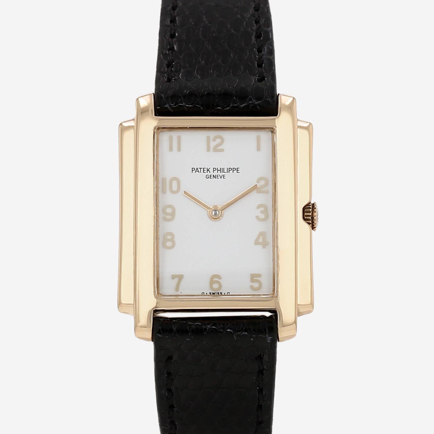Montre bracelet Patek Philippe Gondolo en or jaune. Boitier rectangulaire en or jaune, fond vissé, couronne cannelée.