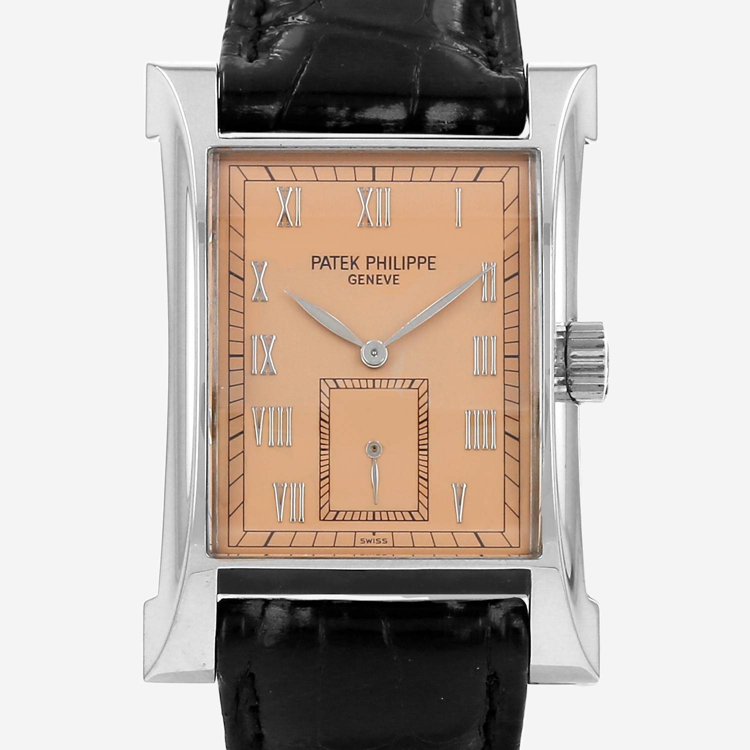 Montre bracelet Patek Philippe Pagoda en or blanc. Boitier rectangle curvex en or blanc, fond clippé, couronne cannelée.