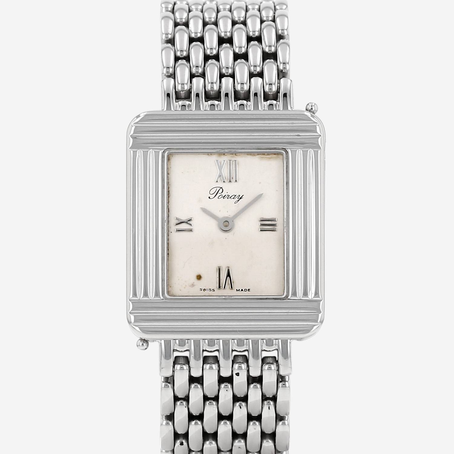 Montre bracelet Poiray Ma Première en acier. Boitier rectangulaire en acier à triple godrons, fond vissé, couronne cannelée.