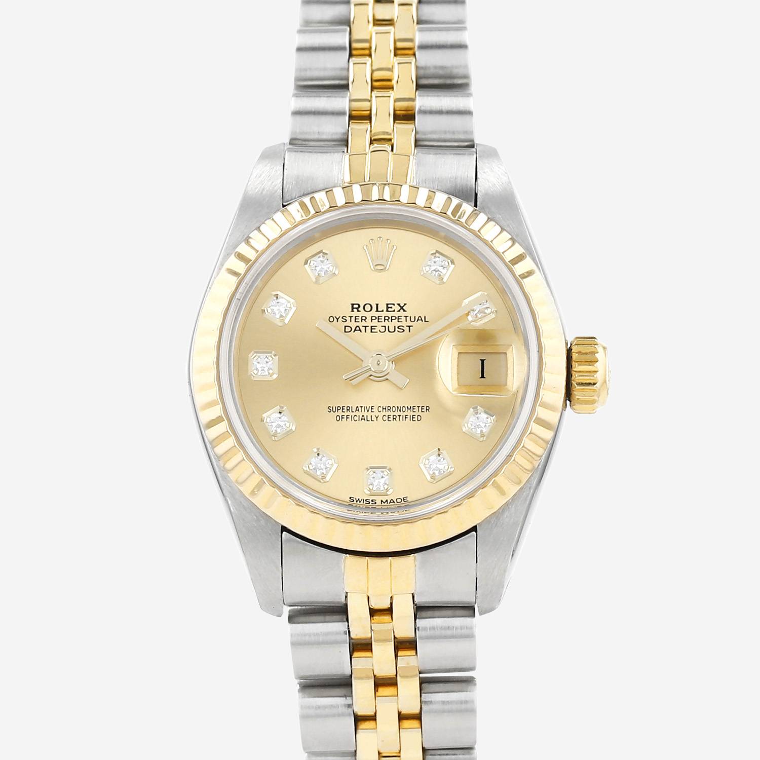 Montre bracelet Rolex Datejust Lady en or et acier. Boitier rond en or et acier, fond vissé, lunette striée en or jaune, couronne vissée.