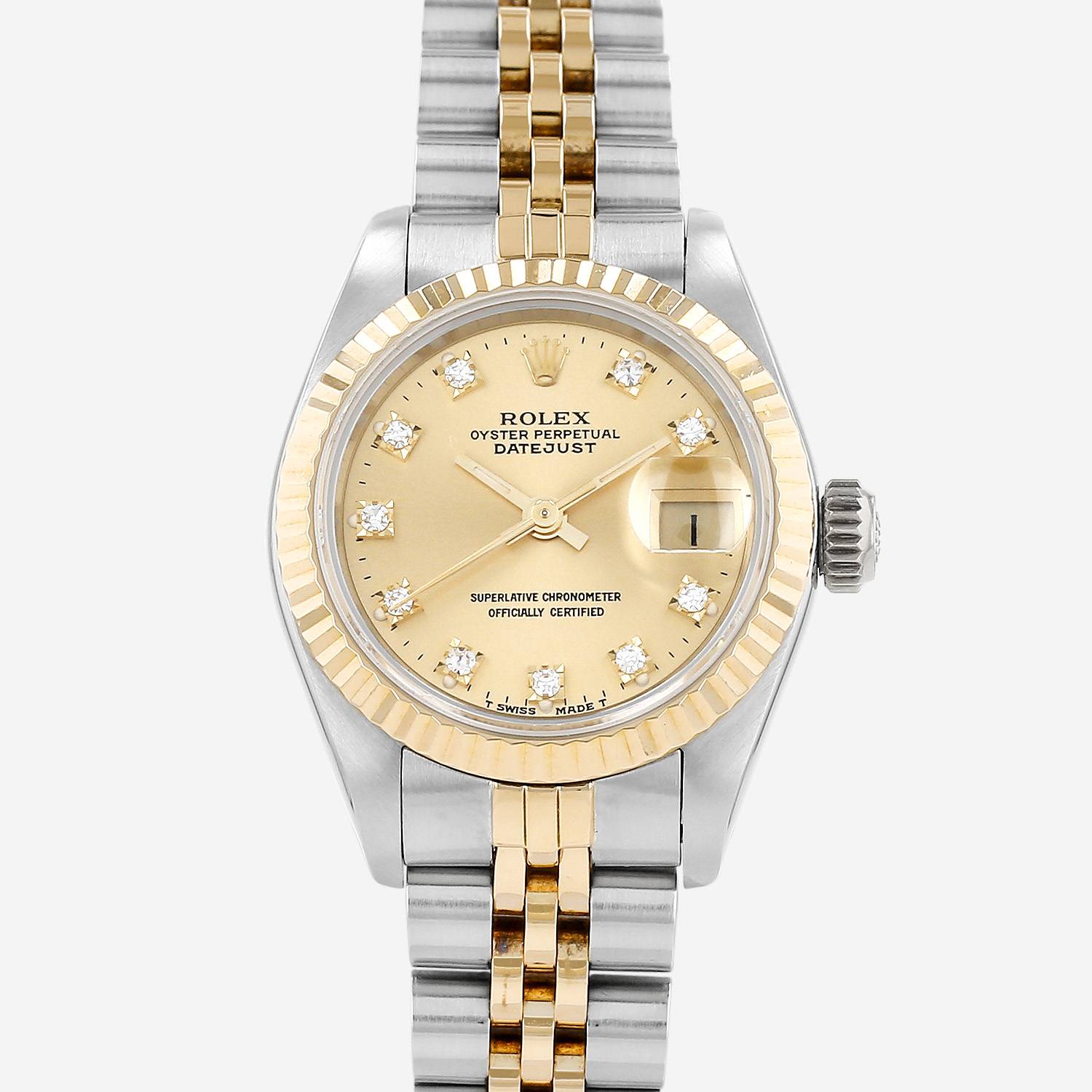 Montre bracelet Rolex Datejust Lady en or et acier. Boitier rond en or et acier, fond vissé, lunette striée en or jaune, couronne vissée.