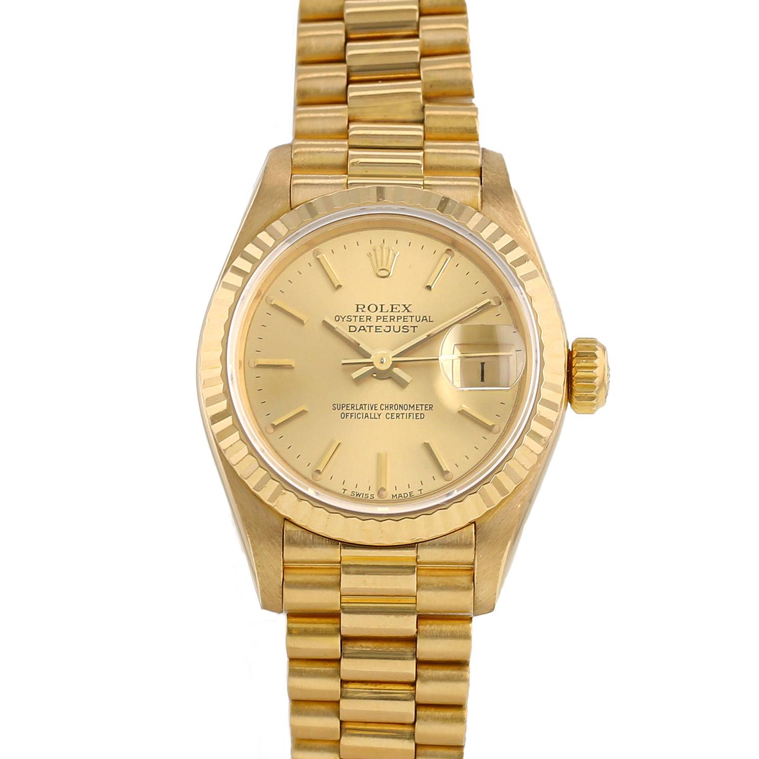Montre bracelet Rolex Datejust Lady en or jaune. Boitier rond en or jaune, fond vissé, lunette striée en or jaune, couronne vissée.