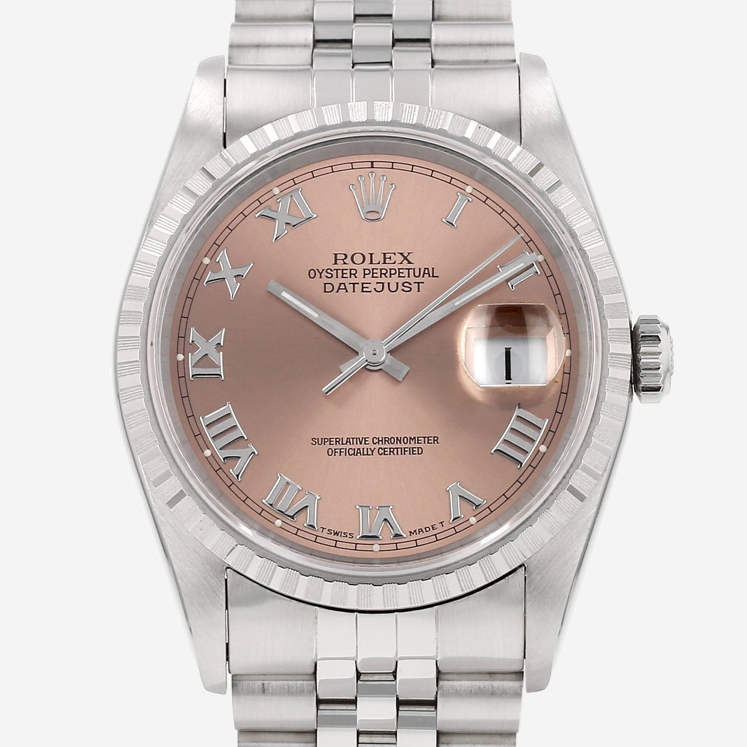 Montre bracelet Rolex Datejust en acier. Boitier rond en acier, fond vissé, lunette striée en acier, couronne vissée.