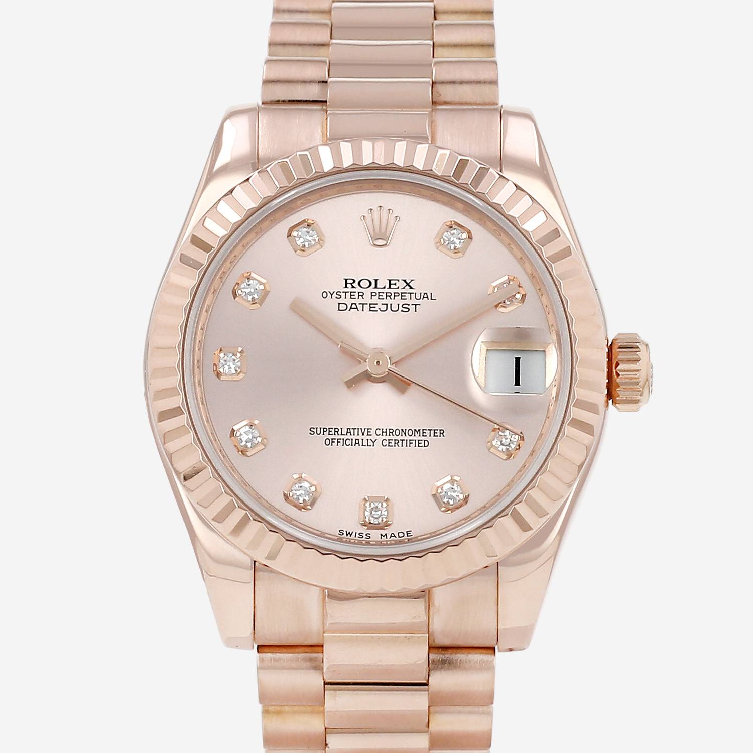 Montre bracelet Rolex Datejust en or rose. Boitier rond en or rose, fond vissé, lunette striée en or rose, couronne vissée.