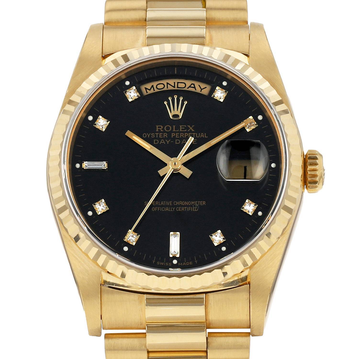 Montre bracelet Rolex Day-Date en or jaune. Boitier rond en or jaune, fond vissé, lunette striée en or jaune, couronne vissée.