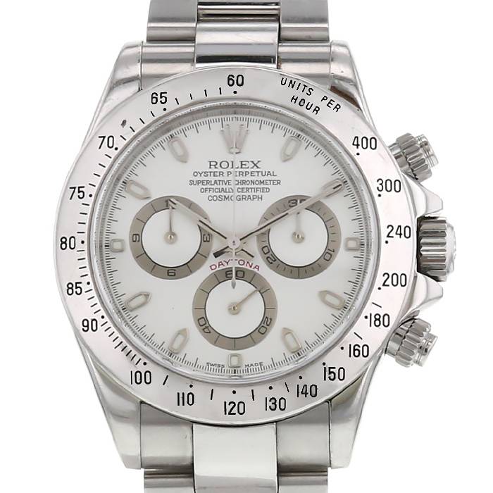 Montre bracelet chronographe Rolex Daytona en acier. Boitier rond en acier, lunette graduée échelle tachymétrique en acier, couronne vissée.